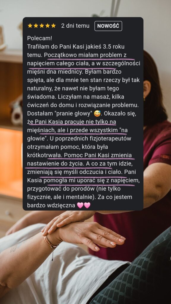 - Korzystam z testów mięśniowych i technik pracy z układem nerwowym, aby jeszcze lepiej zrozumieć przyczyny problemów. Terapia zawsze dopasowana jest do Ciebie – dzielę się swoimi obserwacjami, ale to Ty decydujesz, co jest dla Ciebie ważne.